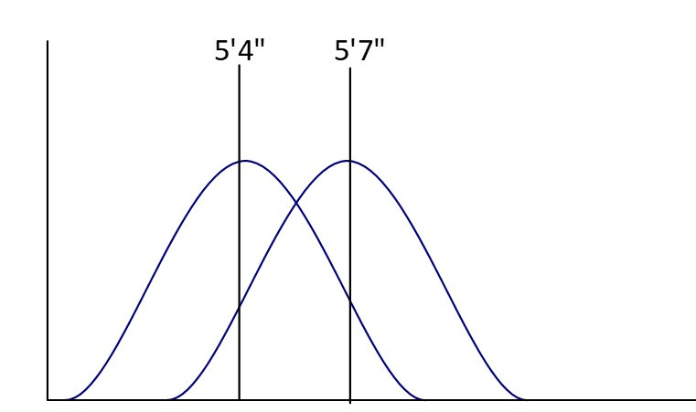 The normal curve can be more complicated than one might imagine. Let’s take the example of body temperature in people without a fever (temperature below 100.4° F). With modern thermometers, the human body temperature has a mean of 97.7° F (not 98.6° F) with 95% of non-febrile persons having a body temperature between 96° and 99° F. This means that body temperature and its bell curve are consistent all over the world and have been for generations. Height is a little different. What is the average height of a human? That varies according to which generation and region of the world about which you are referring. A man born in the Western world in 1896 would have an average height of 5’ 4” while a man born in 1996 would have an average height of a little over 5’7.” The standard deviation for both populations is about 3 inches, so the two bell curves would look like this on a graph: