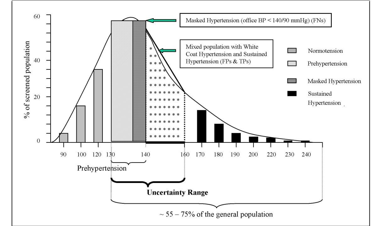 In this sample of patients, the average systolic blood pressure is around 130 mm Hg. The bell curve is skewed to the right because of the small number of people with marked or sustained hypertension. Between 130-160 mm Hg systolic, there are people who have “white-coat hypertension” as well as people whose blood pressure might be low in the office but possibly elevated at home. The authors put these people in an “Uncertainty Range.” At one time, 140/90 mm Hg was considered the cutoff for high blood pressure for people under 65 years old. This was lowered by the American Heart Association to 130/80 mm Hg in 2017. Where did these cutoffs come from? Scientists studied large datasets and clinical trials over decades and found that people with blood pressures above this level were more likely to suffer heart attacks, strokes and other cardiovascular disease. In contrast, people whose blood pressure was lowered to 130/80 with medication were less likely to suffer these consequences. Does hypertension have a specific cause? Do we understand its pathophysiology completely to determine that it is truly a disease? In fact, a single cause of hypertension has not been established. There are risk factors for hypertension, including genetics (30-60% of the variance), obesity, smoking, salt intake and activity level. These factors combine, in unclear ways, to lead to high blood pressure in up to 60% of people in the U.S. by the time they reach 65.