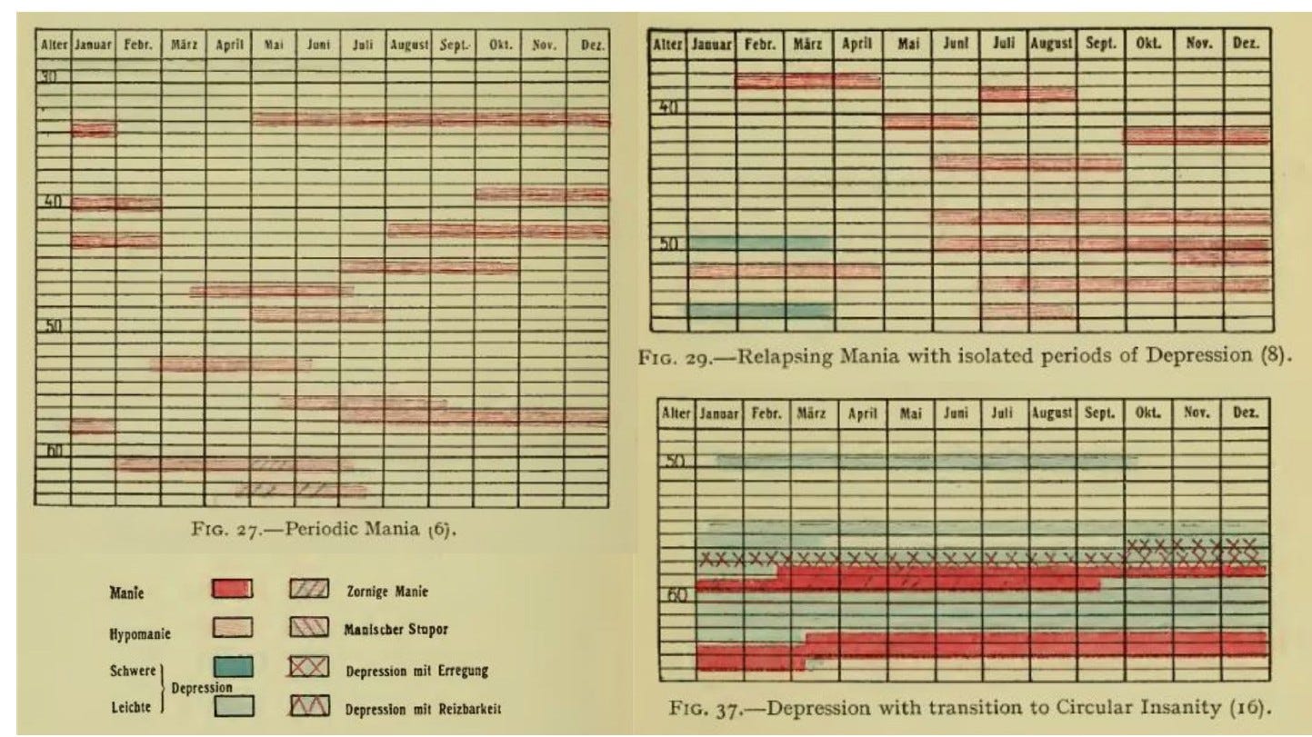 In the figure above, “Alter” means age in German (in years). Kraepelin noted changes in manic and depressive symptoms in these patients over time. As he accumulated his cards, he observed that patients fell into either of two major groups. “Manic-depressive” patients had alternating moods and better prognosis, while the patients in the other group had early onset, flattened emotions and social withdrawal. This latter group appeared to deteriorate cognitively with time, so Kraepelin characterized them as having “dementia praecox.” This fundamental distinction between these groups of symptoms and their course remains with us today as bipolar disorder and Schizophrenia. (In 1908, Paul Bleuler noted that the latter illness does not always lead to deterioration and suggested the term Schizophrenia to replace it.) Kraepelin’s approach competed with Freud’s throughout the first half of the 20th century, even though they saw very different patients. Kraepelin dealt with serious mental illness, while Freud focused on those with neuroses (or anxiety by modern definitions).